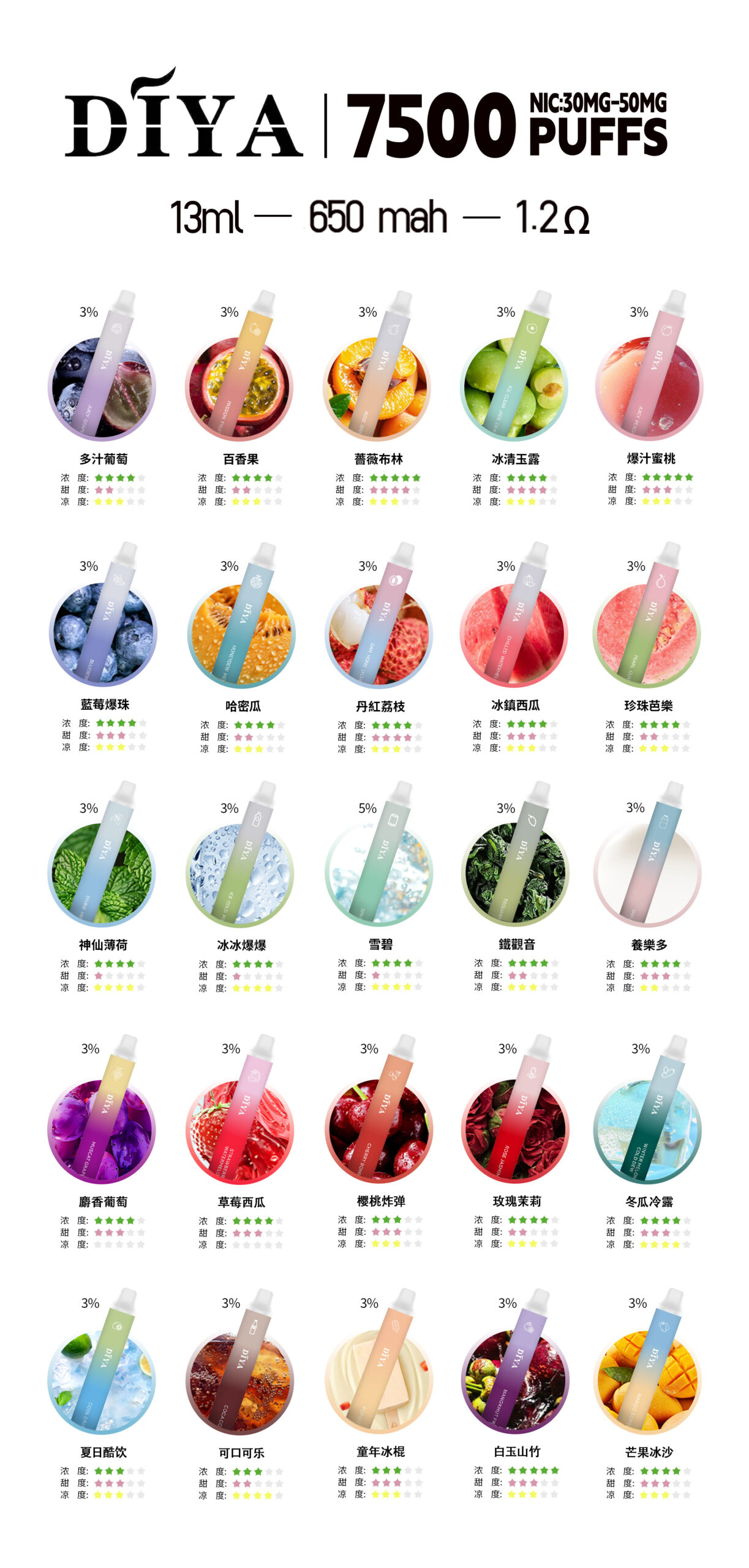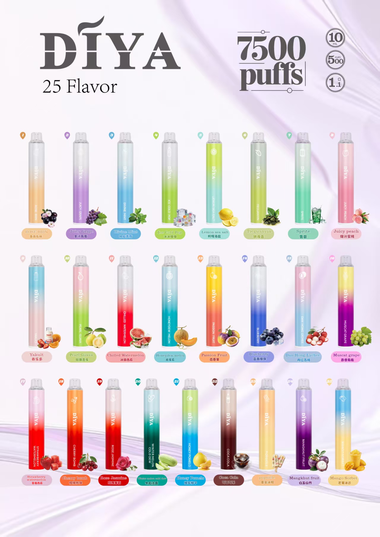 這些特點展示了DIYA 7500 PUFFS電子煙的多樣性和用戶友好的設計,旨在提供豐富的口味選擇和舒適的使用體驗。